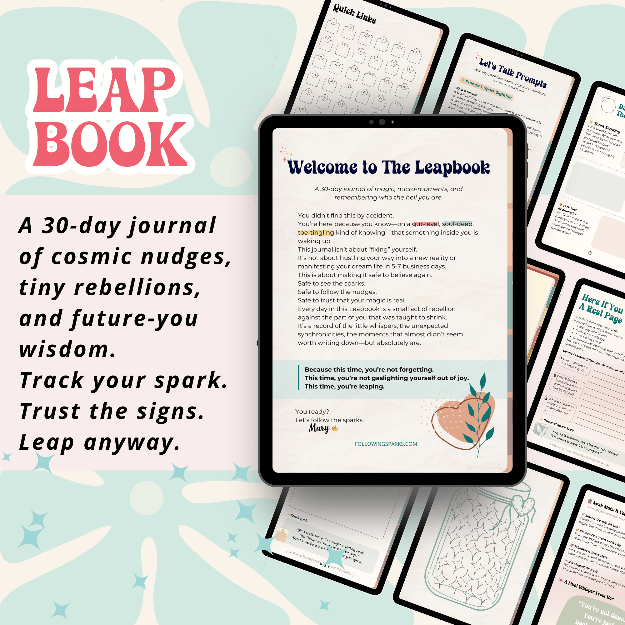📦 What You Get: ✔ 30 daily guided pages with layered prompts ✔ Rest/reflection pauses every 10 days ✔ Spark Jar tracker ✔ Printable + digital format✔ Cosmic cheerleading (without the fluff) + Curated bonues that complement your journal and ​journey